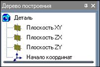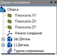 В Дереве построения появляются два компонента сборки (рис.5). Один из них, вставленный в сборку первым (Деталь 1), автоматически фиксируется в том положении, в котором он был вставлен (этот компонент обозначается буквой ф). Фиксированный компонент не может перемещаться в системе координат (при желании фиксацию можно отключить в Свойствах компонента).