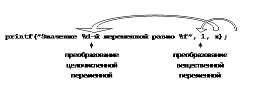 Здесь верхние стрелки указывают позиции внутри форматной строки, куда будут выведены значения переменных i и x. Остальной текст форматной строки будет отображен без изменения. К примеру, если переменная i к моменту выполнения этого оператора имела значение 5, а переменная x была равна 1.5, на экран будет выведено: «Значение 5‑й переменной равно 1.500000».