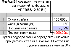 Например, средство «Подбор параметра» используется для изменения процентной ставки в ячейке B3 в сторону увеличения до тех пор, пока размер платежа в ячейке B4 не станет равен 900,00р.