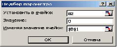 - в окне диалога Подбор параметра в поле Установить в ячейке задать абсолютную ссылку на ячейку, содержащую расчетную формулу, а в поле Значение — то значение, которое следует получить в качестве результата формулы;