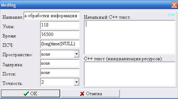 В окне «Начальный С++ текст» при необходимости переопределяются имена параметров транзактов и задаются числовые константы.
