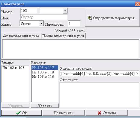 Параметры узлов могут быть заданы константами или переменными пользователя. Во втором случае в момент входа в узел очередной заявки значения этих параметров должны быть определены с помощью операторов языка С++.