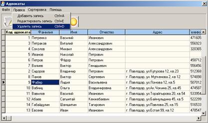 Путем нажатия на одну из кнопок находящейся в левой части главной формы программы, запускается модуль программы содержащий таблицу адвокаты (клиенты, текущие дела, завершённые дела), а также выйти из программы (рисунок 9).