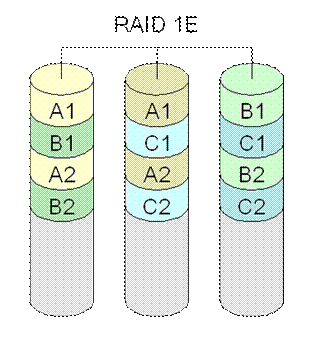 Комбинирует в себе RAID 0 и RAID 1. Создаётся минимум на трёх дисках. Данные пишутся с чередованием на три диска, а со сдвигом на 1 диск пишется их копия. Если пишется один блок на три диска, то копия первой части пишется на второй диск, второй части – на третий диск. При использовании четного числа дисков лучше, конечно, использовать RAID 10.