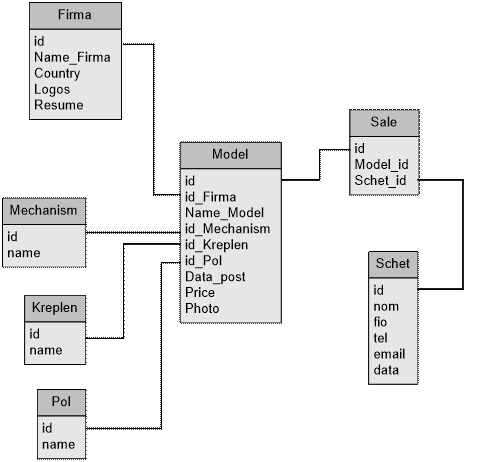 Основной структурой данных является база данных, в которой содержится информация о фирмах, моделях часов, продажах, счетах и типах механизма и крепления. Всего в базе данных существует семь таблиц. Их описание представлено ниже.