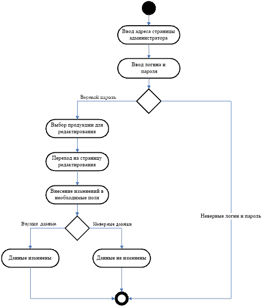 | АДМИНИСТРАТОР | Человек, занимающийся поддержанием работы сайта. Может просматривать и редактировать размещённую на сайте информацию о товарах и услугах, может добавлять новый товар, редактировать характеристики, просматривать статистические данные. Использует возможности графического интерфейса приложения. Требуются средние навыки работы с ПК. |