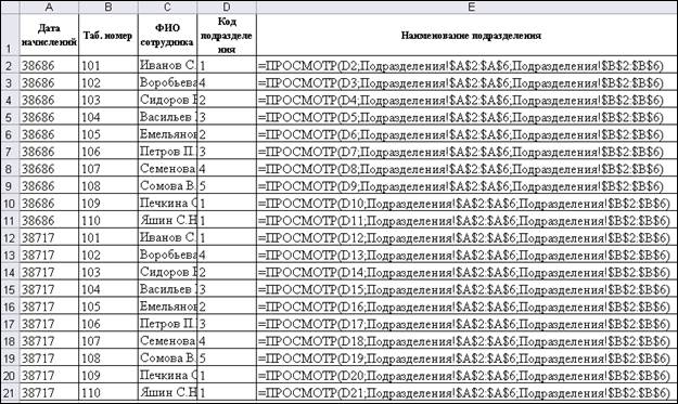 =ПРОСМОТР(D2;Подразделения!$A$2:$A$6;Подразделения!$B$2:$B$6)