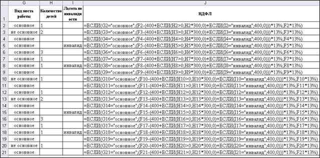 =ЕСЛИ(G2="основное";(F2-(400 + ЕСЛИ (H2>0;H2*300;0) + ЕСЛИ (I2 = "инвалид"; 400;0))) *13%;F2*13%)