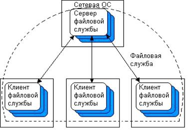 Совокупность серверной и клиентской частей ОС, предоставляющих доступ к конкретному типу ресурса компьютера через сеть, называется сетевой службой. В приведенном выше примере клиентская и серверная части ОС, которые совместно обеспечивают доступ через сеть к файловой системе компьютера, образуют файловую службу.