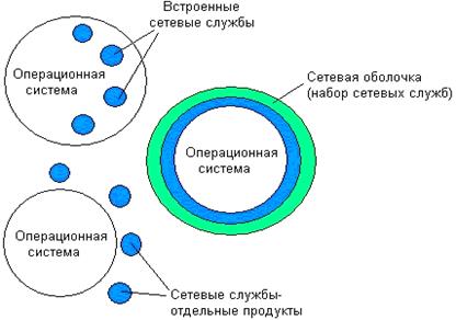 На практике сложилось несколько подходов к построению сетевых операционных систем, различающихся глубиной внедрения сетевых служб в операционную систему (рис. 1.5):