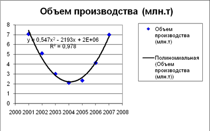 Наиболее оптимальная аппроксимация для исходных данных – полиномиальная кривая (квадратная парабола), так как величина достоверности наиболее близка к единице. Общий вид графика близок к фактическому расположению исходных данных в виде точек на плоскости.