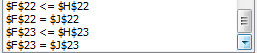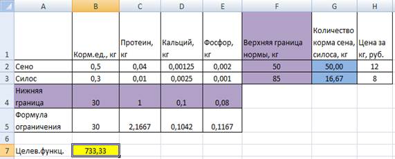В ячейках F2:F3 – значения, ограничивающие количество сена и силоса. В задании условий используются такие формулы: