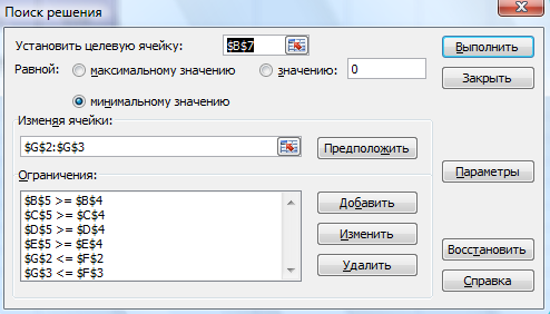 Ячейки G2:G3 – искомое решение задачи. Ячейки В5:Е5 – формулы ограничений: