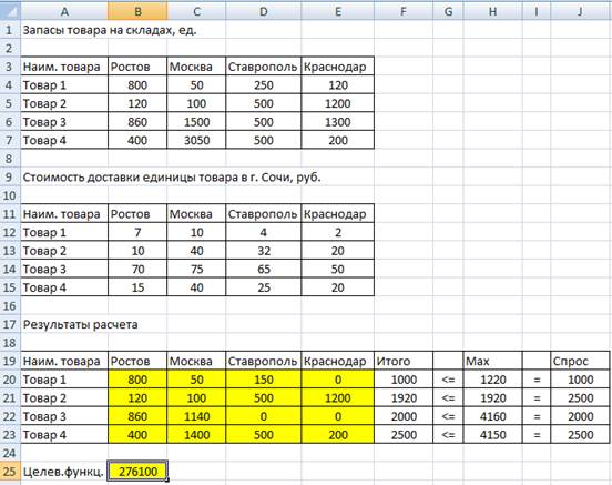 В столбце «Max» находятся формулы для расчета предельных объемов перевозок: