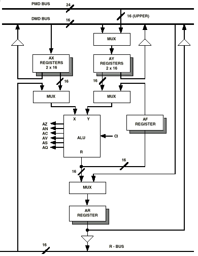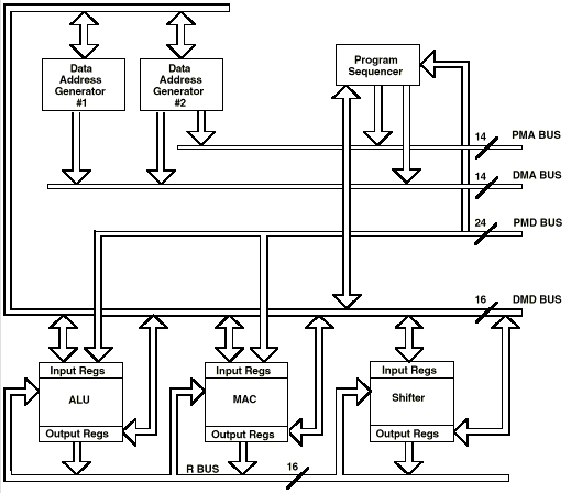 Адресная шина PMA шириной 14 бит обеспечивает достум к 16Кбайтам смешанной системы команд и данных. 24-разрядная шина PMD предназначена для работы с 24-битными командами.