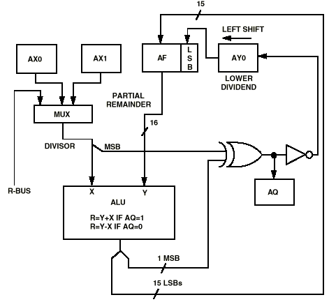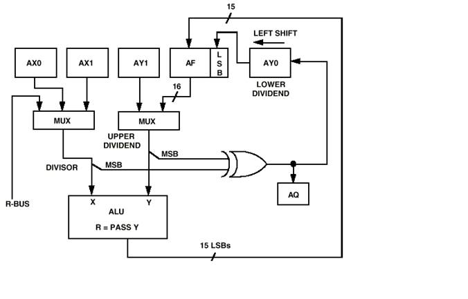 Второй примитив из раздела деления – это команда DIVQ, которая выполняется неоднократно и генерирует по одному биту частного. При простой точности деления чисел без знака команда DIVQвыполняется 16 раз, для такой же точности деления чисел со знаком операция выполняется 15 раз после вычисления знакового разряда с помощью команды DIVS. DIVQ сдвигает регистр AY0 влево на один разряд так, чтобы новый бит частного оказался в позиции LSB. Состояние бита AQ, которое генерируется на предыдущей операции, определяет операцию ALU для вычисления частичного результата. Если AQ=1, то ALU добавляет делитель к частичному результату в AF. Если AQ=0, то ALU вычитает делитель из частичного результата в AF. Так же как и в операции DIVSALU выводит результат в регистр AF. Операция DIVQпроиллюстрирована на рис.2.3.