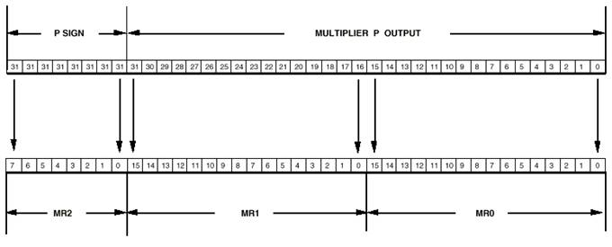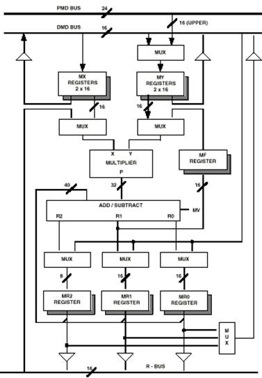 МАС имеет два входных 16-разрядных порта X и Y и 32-разрядный порт вывода результата P. 32-разрядный результат поступает в 40-разрядный блок сложения/вычитания, который либо прибавляет, либо вычитает текущий результат из регистра результата МАС (MR), либо передает текущий результат непосредственно в MR (регистр MR имеет 40 разрядов). Фактически регистр MR состоит из трех (MR0 и MR1 – 16-разрядные и MR2 – 8-рахрядный) регистров.