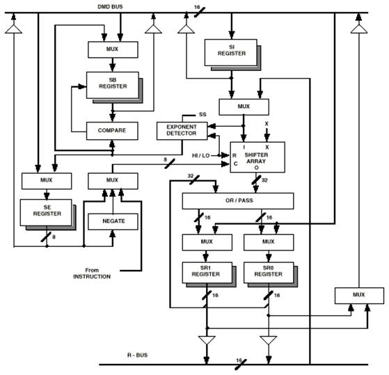 Массив сдвига и связная логика OR/PASS окружены набором регистров. Входной регистр Shifter (SI) содержит данные для массива сдвига и детектора порядка. SI-16-разрядный, записывается и читается с DMD-шины. В качестве входных регистров для массива сдвига и детектора порядка могут служить AR, SR или MR, подключенные через R-шину. Выходной 32-разрядный регистр SRразделен на две части по 16 разрядов: SR0 и SR1. Они могут быть загружены с DMDшины и выведены на R- или DMD-шину. Также SR подключен к блоку OR/PASS логики для проведения сдвигов двойной точности.