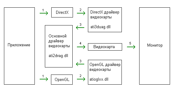 Но как же тогда обновляются или совершенствуются возможности библиотеки, если файл не изменяется? DirectX, напротив, обновляется чуть ли не каждый месяц. Дело в том, что DirectX и OpenGL, в основном, не общаются с видеокартой напрямую, а используют в качестве надежного посредника ее драйвер. Вот, например, схема взаимодействия приложения и монитора компьютера с видеокартой ATI Radeon: