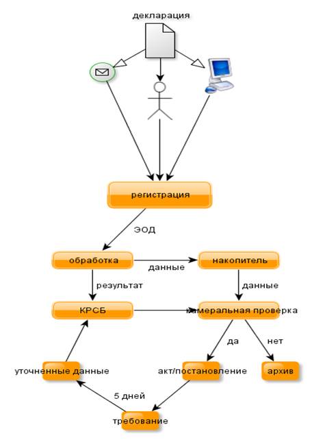 5. Разработанная в ходе исследования модель представляет собой взаимодействие процессов, демонстрирующих схему движения налоговой декларации в налоговом органе: