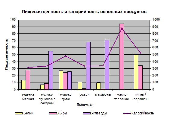 1) Построить диаграмму пищевой ценности и калорийности основных продуктов.