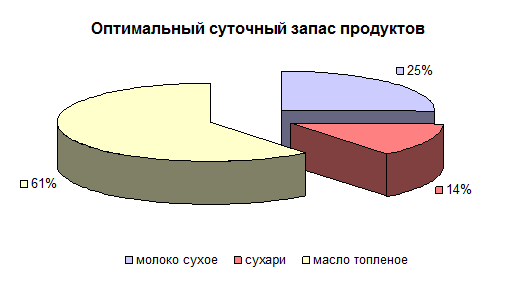 Используя инструмент Мастер Диаграмм , строим диаграмму «Оптимальный суточный запас продуктов».