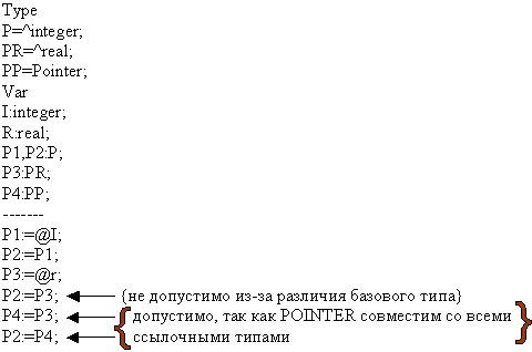 | Разыменование имеет тип, совпадающий с базовым типом переменной - указателя; то есть конструкция P1^ считается переменной целого типа. |