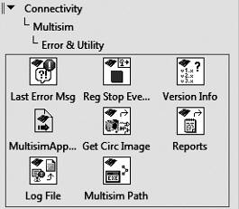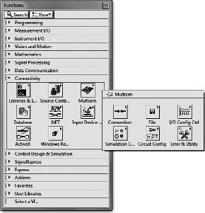После установки Multisim Automation with the LabVIEW Multisim Connectivity Toolkit (beta) новую палитру ВП можно найти в Functions → Connectivity → Multisim, а так же в Functions → Addons → Multisim (см. рис.1).