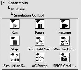 Эти ВП позволяют контролировать процесс моделирования: запуск, пауза, остановка, возобновление и т.п. Также производить частотные характеристики и контролировать процесс с помощью команд командной строки (SPICE). |