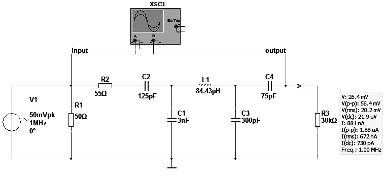 Используя вышеупомянутые инструкции соберем схему с внутриемкостной связью с антенной и внутриемкостной связью с нагрузкой входной цепи бытовых радиоприемников (см. рис.2). На вход реального лабораторного макета подается синусоидальный сигнал с ВЧ генератора амплитудой 50 мВ и частотой, изменяемой в пределах 600…1400 кГц. Поэтому в схеме собранной в Multisim установим источник переменного напряжения – DC_POWER. Конечно, далее, уже в LabVIEW значение источника будем менять по частоте в заданном диапазоне, но для правильной синхронизации программных средств, нам нужно установить любое значение. Поэтому выбрано значение чатоты 1 МГц. R3 является нагрузкой схемы, поэтому выбор ветви пал на ветвь «output». Куда и устанавливаем «пробник». Изменим имя пробника с «Probe1» на «output». На этом подготовка в среде Multisim закончена.