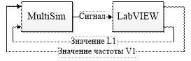 Рис.3. Обмен данными между MultiSim и LabVIEW модели