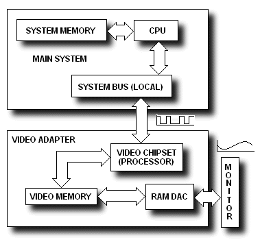 Т.е. графический процессор осуществляет чтение из видеопамяти или запись в нее через один порт, а RAMDAC осуществляет чтение данных из видеопамяти, используя второй независимый порт. В результате графическому процессору больше не надо ожидать, пока RAMDAC завершит свои операции с видеопамятью, и наоборот, RAMDAC больше не требуется ожидать, пока графический процессор не завершит свою работу с видеопамятью.