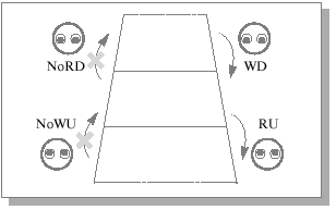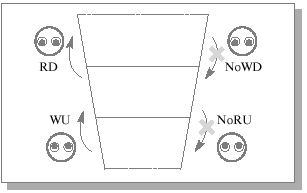 Таким образом, правила нечтения верхнего уровня (No Read Up, NoRU) и незаписи на нижний уровень (No Write Down, NoWD) в модели секретности запрещают нисходящие информационные потоки. Заметим, что запись на верхний уровень (WU) правилами не запрещена: любой нижестоящий субъект вправе информировать вышестоящие инстанции о том, что происходит на его уровне (см. рис. 9.1).