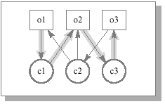 Для выявления всех возможных информационных потоков в системе составляется диаграмма достижимости. Диаграмма достижимости состоит из вершин двух видов: субъектов и объектов, соединенных стрелками: от объекта к субъекту - возможные операции чтения, от субъекта к объекту - записи. Достижимость (возможность пройти по диаграмме, следуя стрелкам) одной вершины-субъекта с другой вершины-субъекта означает потенциальную возможность передачи данных от одного к другому, хотя бы и не напрямую. Достижимость вершины-объекта с другой вершины-объекта как раз и отражает информационный поток от одного объекта (класса объектов) к другому (см. рис. 9.3).