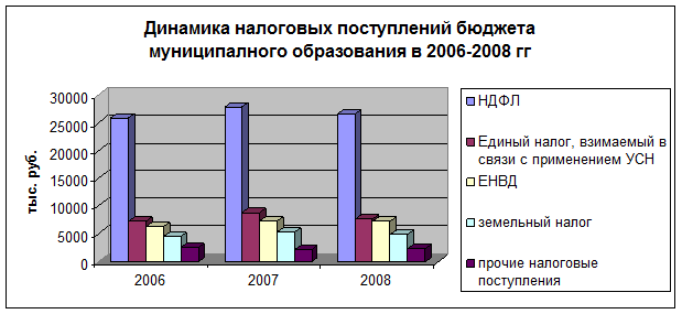 Рисунок 1.1 – Гистограмма динамики налоговых поступлений в бюджет муниципального образования за 2005-2008гг