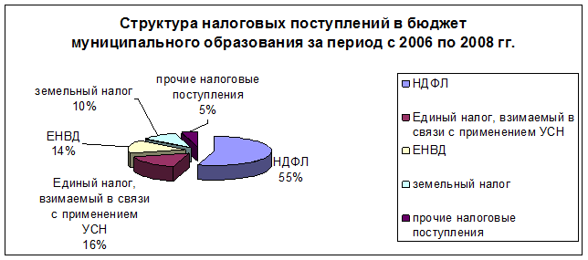 Рисунок 1.2 –Круговая диаграмма структуры налоговых поступлений в бюджет муниципального образования за 2005 – 2008 гг.