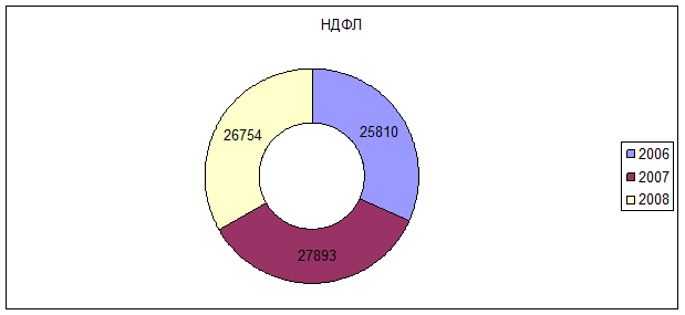 Рисунок 1.3 – Кольцевая диаграмма структуры НДФЛ в налоговых поступлениях бюджета муниципального образования за 2006-2008 гг, тыс. руб.