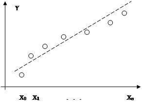 При большом количестве узлов интерполяции получается высокая степень многочлена (2.1) в случае глобальной интерполяции, т.е. когда нужно уметь один интерполяционный многочлен для всего интервала изменения аргумента. Кроме того, табличные данные могли быть получены путем измерений и содержать ошибки. Построение аппроксимируемого многочлена с условием обязательного прохождения его графика через эти экспериментальные точки означало бы тщательное повторение допущенных при измерениях ошибок. Выход из этого положения может быть найден выбором такого многочлена, график которого проходит близко от данных точек (рис.1, штриховая линия).