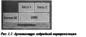 Именно гибридный подход к VMM используется в двух популярных решениях виртуализации от Microsoft: в MicrosoftVirtualPC 2007 и в MicrosoftVirtualServer 2005 R2. И хотя производительность его выше, чем у виртуальных систем типа 2, она все еще не так высока, как была бы у двух раздельных физических компьютеров.