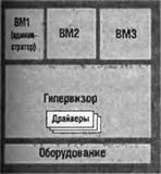 В наши дни имеется и третий тип технологии виртуализации — VMM типа 1 или технология гипервизора. Гыпервизор (hypervisor) — это программный уровень, расположенный непосредственно над оборудованием и под одной или несколькими ОС. Его основное назначение — организовать изолированные среды выполнения, называемые разделами (partition), внутри которых будут работать виртуальные машины с гостевыми ОС. Каждому разделу выделяется собственный набор аппаратных ресурсов, в который входят память, процессорное время и устройства, а гипервизор отвечает за организацию доступа к реальному оборудованию.