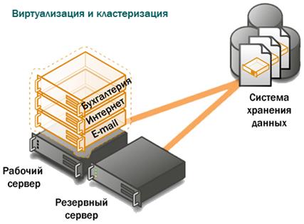 Виртуализация и здесь придет на помощь. Гостевая (guest) ОС, работающая на виртуальной машине (ВМ), вообще говоря, не зависит от оборудования, на котором работает базовая (host) ОС. Поэтому вы с легкостью восстановите виртуальный сервер на системе, оборудование которой отлично от аппаратной комплектации «сгоревшего* компьютера. За счет облегчения процесса восстановления, благодаря виртуальным ма шинам вы сократите плановое и внеплановое время простоя и обеспечите доступность 1ажных сетевых служб.