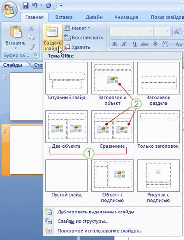 2. В группе Слайды вкладки Главная щелкните стрелку рядом с кнопкой Создать слайд. (см. Рис 2)