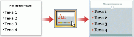 Office PowerPoint 2007 предоставляет множество тем (Тема. Набор унифицированных элементов, определяющих внешний вид документа с помощью цвета, шрифтов и графических объектов.) , упрощая изменение общего вида презентации. Тема представляет собой набор элементов оформления, придающий особый, единообразный внешний вид всем документам Office, используя конкретные сочетания цветов, шрифтов (Шрифт. Набор букв, цифр и других символов определенного вида. Примерами шрифтов могут служить шрифты Arial или Courier New. Как правило, шрифт может иметь различные размеры (например, 9 и 10 пунктов) и начертание (например, полужирный или курсив).) и эффектов.