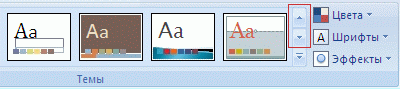 Примечания. Для предварительного просмотра внешнего вида текущего слайда после применения конкретной темы наведите указатель на эскиз этой темы. Чтобы увидеть эскизы дополнительных тем, щелкните стрелки рядом со строкой эскизов. (см. Рис 6)