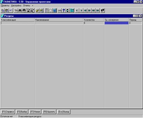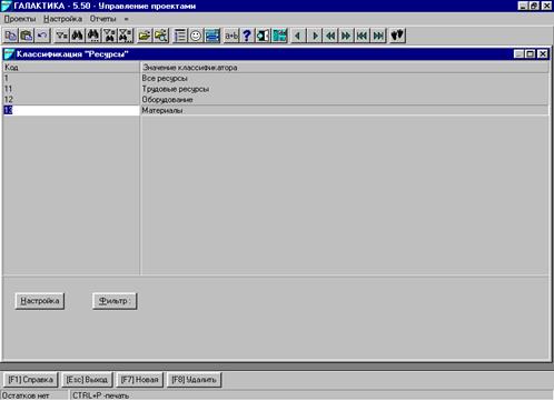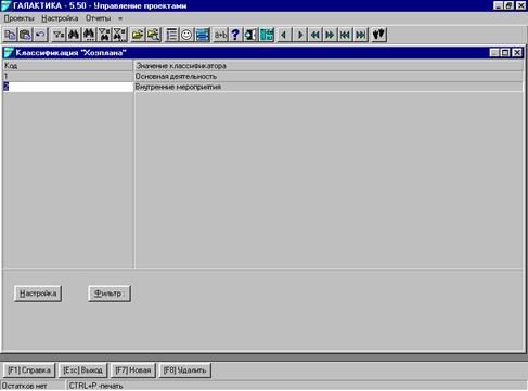 Для структуризации информации, хранящейся в различных каталогах, в ПК "Галактика" применяются встроенные классификаторы. В модуле "Управление проектами" используются классификации хозяйственного плана и ресурсов, которые вводятся функциями "Классификация направлений деятельности" и "Классификация ресурсов" соответственно.