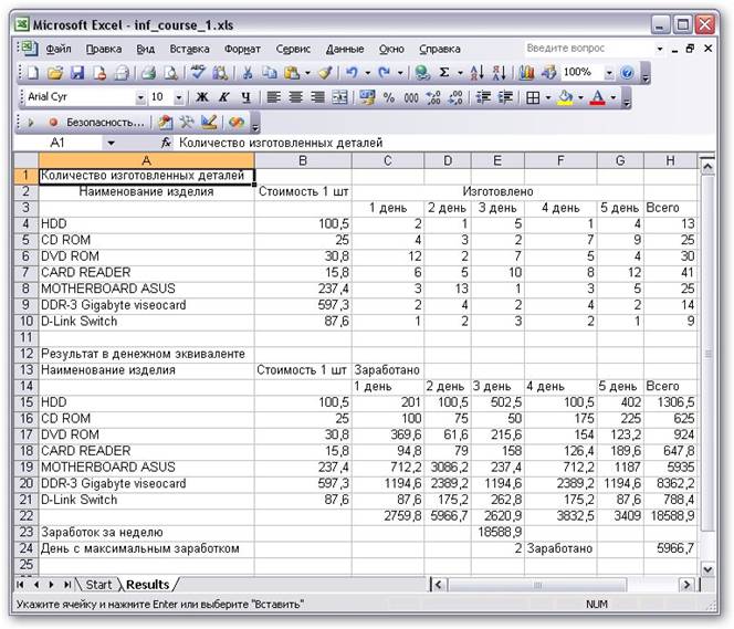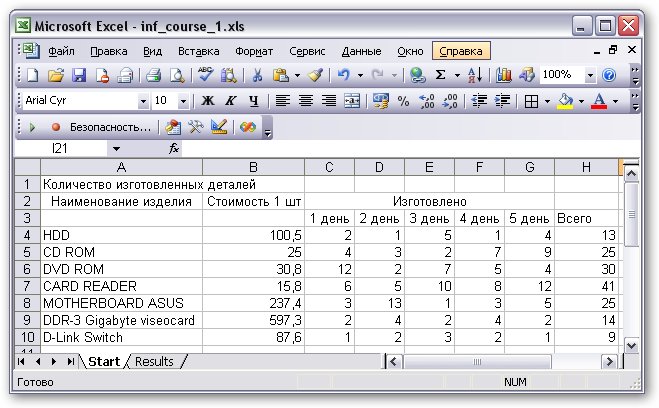 - исходные данные в виде таблицы, где перечислены наименования деталей, стоимость их изготовления, количество деталей, изготовленных за каждый день;