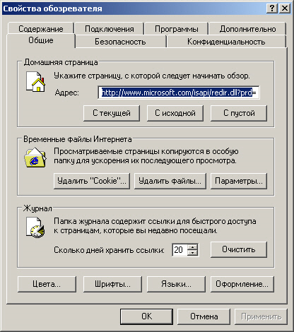 Область Домашня сторінка дозволяє задати сторінку, звану домашньою і завантажувану за умовчанням при кожному запуску оглядача. Саме до цієї сторінки здійснюється перехід при натисненні кнопки Додому на панелі інструментів вікна оглядача. У області Домашня сторінка розташовано поле, що містить адресу сторінки, і три кнопки: З поточною, З початковою, З порожньою. При натисненні кнопки З поточною у полі Адреса заноситься адреса сторінки, відкритої в оглядачі в даний момент. Натиснення кнопки З початковою наводить до установки як домашня сторінка - сторінка Microsoft, що має адресу < b>http://www.microsoft.com/isapi/redir.dll?prd=ie&pver=5.5&ar=msnhome. Кнопка З порожньою встановлює як домашню порожню сторінку.