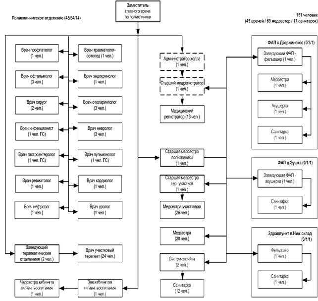 Анализ материалов обследования был проведен на основе построения таблиц (операции бизнес-процессов) и схем (организационная структура регистратуры, схема взаимодействия регистратуры с другими структурными подразделениями поликлиники).