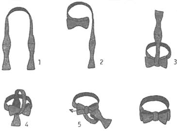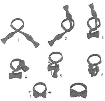 Различие их в том. что бант вы завязываете сами, а бабочка изготовлена производственным способом. Распустив бабочку, вы увидите, что она состоит из кусочков материала. Если вы развяжете бант (при покупке он, как правило, завязан), то у вас в руках окажется цельный кусок материала, напоминающий очень сильно вытянутую восьмерку[5].
