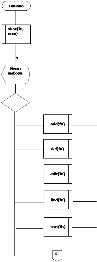 void interface(char *) - функция основного интерфейса программы. В качестве входного параметра принимает имя рабочего файла fn которое передается функциями void create() или void open() . В этой функции реализовано весьма удобное меню, через которое и происходит вызов последующий функция добавления, сортировки, удаления, поиска и редактирования;